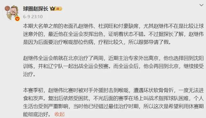 今年亚洲杯,赵继伟是因要治疗喉咙部位伤病特意跟郭士强请假才缺席,不然他势必会随队出征。