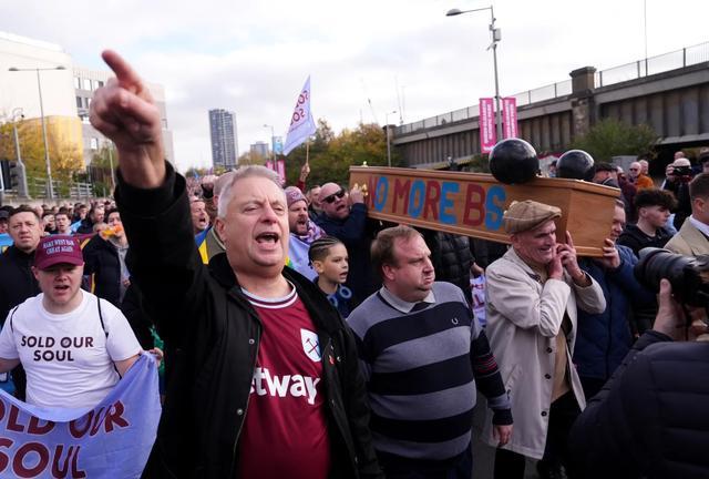 据《太阳报》报道,在西汉姆主场对阵伯恩利赛前,上千名西汉姆联球迷举行激烈抗议游行,前排球迷抬着棺材走向球场,这已经是西汉姆连续第三个主场比赛出现球迷抗议活动。